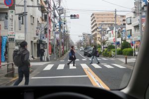 車が信号や停止線で止まろうとしたとき、歩道にいた人が、横断歩道じゃないところをななめに渡ってくることがあります。